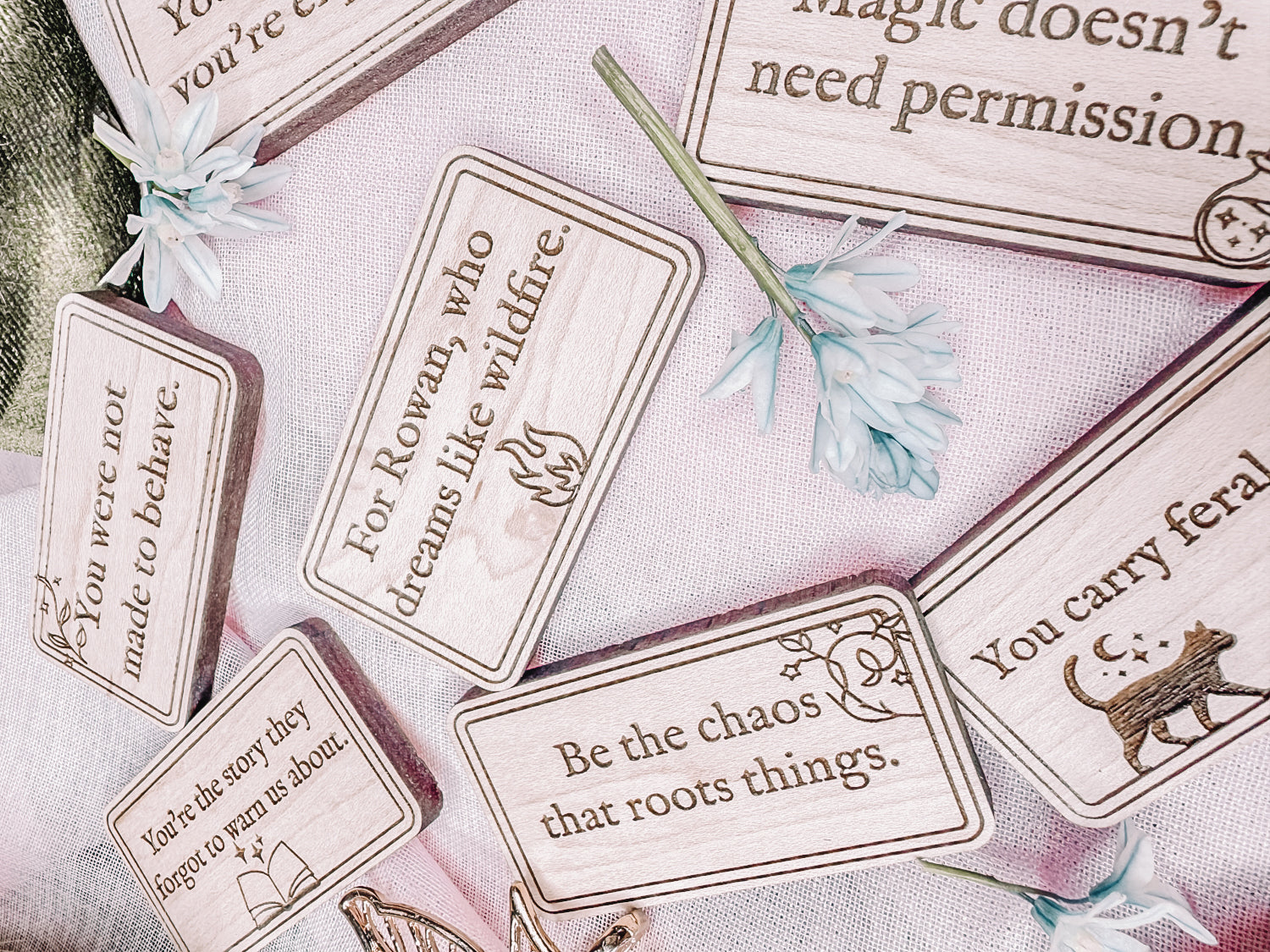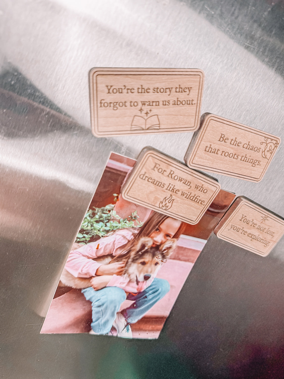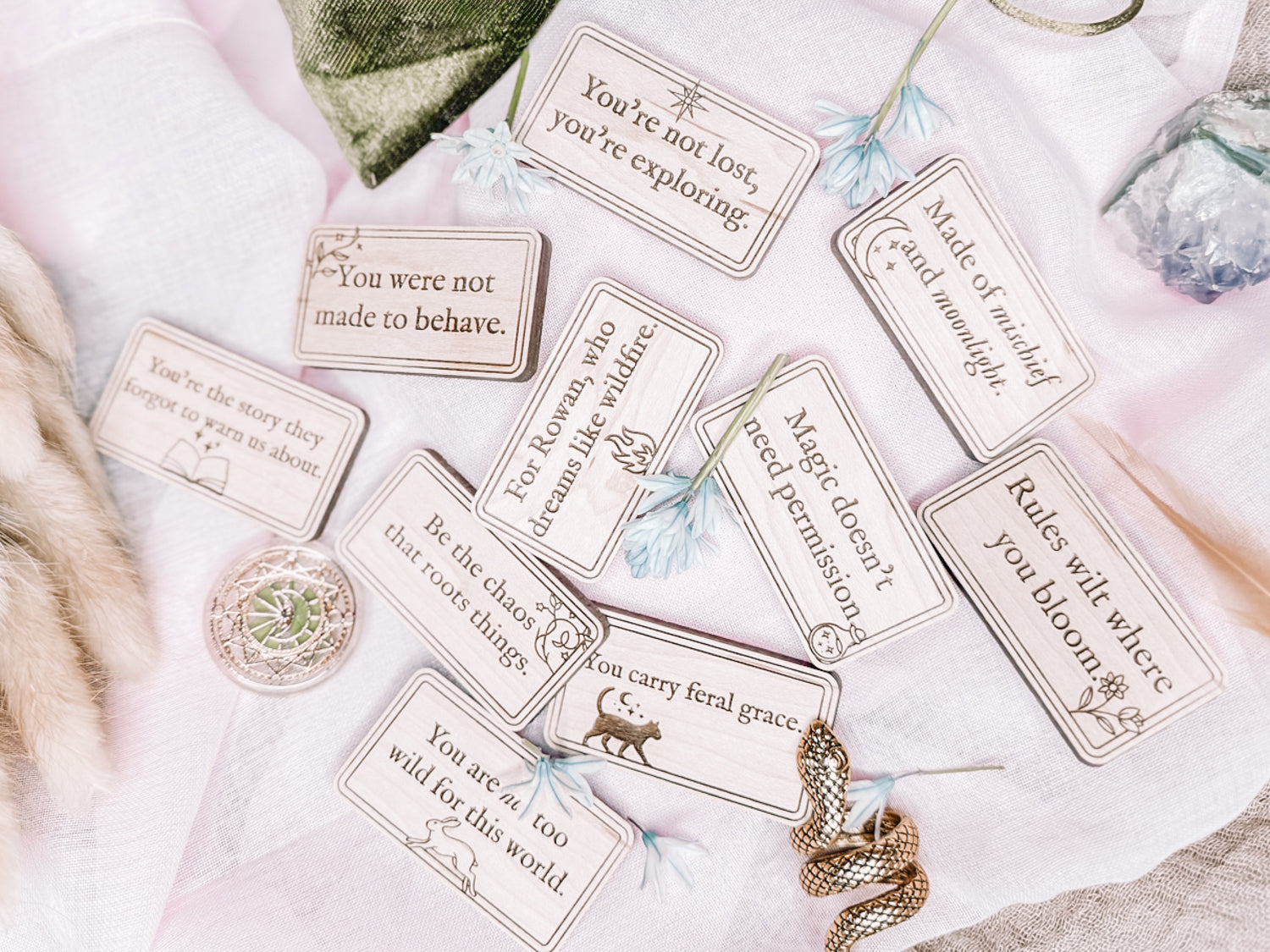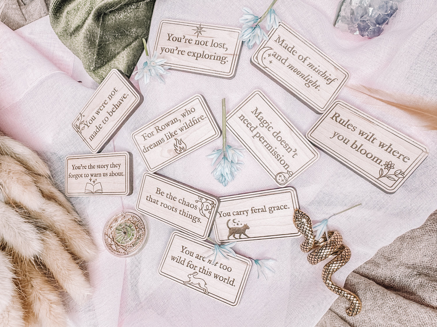 This 10-tile magnet set blends original encouragement with quiet strength. Nine tiles feature poetic mantras from the Pocket Lore collection—each one a soft nudge, a deep breath, or a reason to keep going. The tenth tile is yours to personalize.