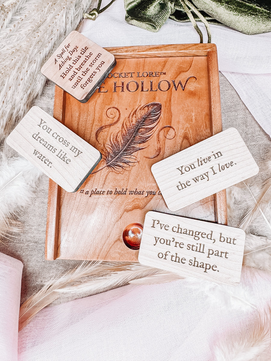 The Hollow is a grief-themed Pocket Lore collection made to comfort, ground, and quietly keep what aches. Inside a solid cherry box are 20 engraved wooden tiles. 18 poetic pieces of reflection and memory, plus 2 small spell tiles made for ritual or release. Each phrase is meant to be held, read, or tucked away on days when words are hard to find.
